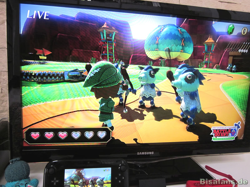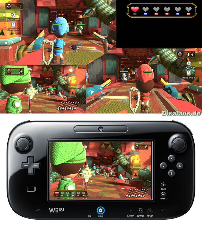 Entsprechend der Auswahl verläuft das Spiel nun unterschiedlich. Als Bogenschütze kann man Zelda übrigens ohne Fernseher spielen, da man alles am GamePad sieht und am Fernseher nur eine größere Version läuft. Vom Gameplay her ist es so, dass die Spielfigur (der eigene Mii im Link-Kostüm) automatisch eine fest vorgelegte Strecke abfährt und immer wieder Gegner auf einen zulaufen. Sobald man den Bogen mit den Joysticks am GamePad spannt, bleibt man stehen. Der Pfeilschuss kann durch das Anspannen des Bogens aufgeladen werden, was den Schuss doppelt so stark macht, allerdings auch die Ladezeiten verdoppelt. Schwierigere Gegner besitzen Schilde, die man nur durch ein Aufladen brechen kann und am Ende eines Levels wartet meist ein Boss. Ferner sind in jedem Level auch geheime Extras wie z.B. versteckte Fässer versteckt, die einen zusätzlichen Spielreiz darstellen. Im Multiplayer teilt man sich den Bildschirm traditionell im Splitscreen-Modus.