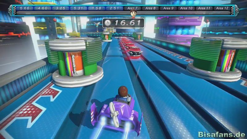 Captain Falcon lädt dann zu einem Rennspiel ein, bei dem der Flitzer durch Neigungen des GamePads gesteuert wird. Dabei gilt es Beschleunigungsfelder zu nutzen und Hindernissen auszuweichen. Der Schwierigkeitsgrad steigt auch hier spürbar von Level zu Level an.