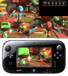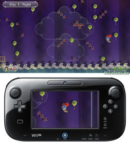 Diese zwei Spiele besitzen ebenfalls sehr originelle Steuerungen über das GamePad. Im Ballonausflug, einem klassischen Side-Scroller, fliegen wir automatisch nach links, müssen jedoch durch Bewegungen am Touchscreen des GamePads für einen Auftrieb mit dem Ballon sorgen. Auf diese Weise sammelt man Ballons ein und weicht Hindernissen wie spitzen Dingen oder Monstern aus. Ein Absturz ins Wasser ist natürlich auch nicht vorteilhaft. Durch ein Tippen auf dem TouchScreen können Hindernisse auch beseitigt werden, wobei es hier auch eine weitere Besonderheit gibt. Auf dem GamePad, den man ständig im Auge behalten muss, sieht man nur einen sehr kleinen Ausschnitt, während auf dem Fernseher ein großer Ausschnitt der Karte zu sehen ist. Es gilt also, so oft wie möglich einen Blick auf den Fernseher zu erhaschen um Vorteile im Spiel zu haben. In der Praxis alles andere als einfach.