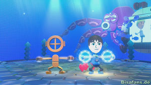In "Tanz den Kraken" müssen wir einem Vortänzer die Bewegungen möglichst zeitlich passend nachahmen. Anstatt jedoch nur Tasten zu drücken, sind hier die unterschiedlichsten Bewegungen notwendig, die nur das GamePad ermöglicht. Eine besonders originelle Schwierigkeit ist, dass der Vortänzer sich gerne auch mal dreht und man die Aktionen dann spiegelverkehrt durchführen muss! Je nach Aktion des Vortänzers muss man auch mal auf den Fernseher und mal auf das GamePad schauen.