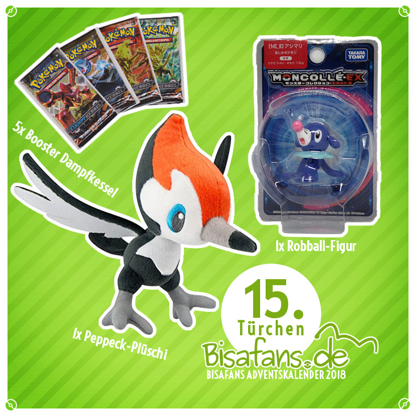 Hinter dem 15. Türchen versteckt sich etwas für Jedermann: Ein süßes Peppeck-Plüschtier und eine Robball-Figur direkt aus Japan! Zusätzlich gibt es noch 5 TCG-Booster! Wir verlosen heute somit die folgenden Gewinne an einen Gewinner: