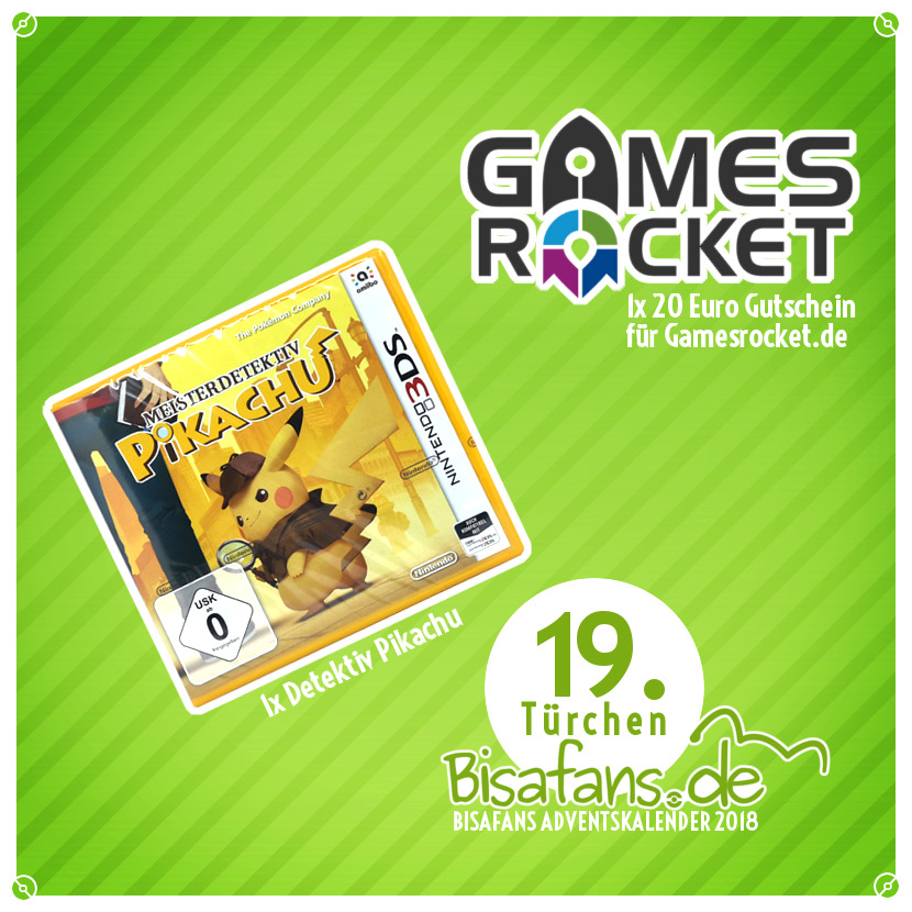 Hinter dem 19. Türchen verstecken sich folgende Preise: Wir verlosen einmal das 3DS-Spiel Detektiv Pikachu. Außerdem gibtt es noch ein 20 Euro-Gutschein für Gamesrocket.de, der perfekt für z.B. eine Nintendo Switch-Onlinemitgliedschaft ist! Wir verlosen heute somit die folgenden Gewinne an einen Gewinner: