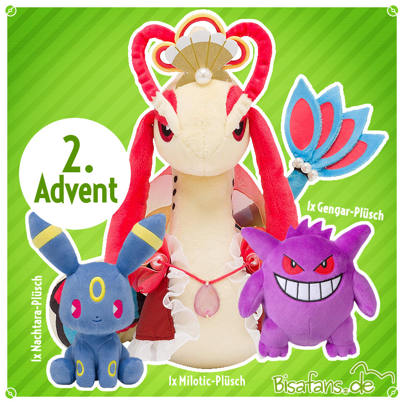 Hinter dem achten Türchen verstecken sich drei Gewinne, die süßer und kuscheliger nicht sein können: Wir verlosen an drei Gewinner jeweils ein Milotic- ein Nachtara und ein Gengar-Plüschi, direkt aus den Pokémon Centern aus Japan! Die drei Plüschies sind daher Originale um die euch jeder Fan beneiden wird und ganz sicher etwas besonderes in eurer Sammlung.
