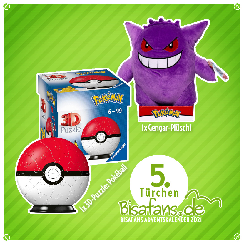 Hinter dem fünften Türchen verstecken sich zwei Klassiker: Wir verlosen ein Gengar-Plüschi und ein 3D-Puzzle in Pokéball-Form! Mit diesen beiden Gewinnen kann jede Pokémon-Sammlung aufgewertet werden. Zu gewinnen gibt es also folgendes für einen glücklichen Teilnehmenden: