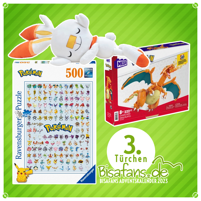 Hinter dem dritten Türchen versteckt sich die erste Verlosung in unserem Adventskalender 2023! Wir verlosen ein süßes schlafendes Hopplo-Plüschtier, sowie ein 500-teiliges Pokémon-Puzzle. Abgerundet werden diese Preise durch ein Bauset für eine Glurak-Figur. Zu gewinnen gibt es also folgende Preise für drei glückliche Teilnehmende: