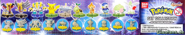 Wie bereits im ersten Artikel zu den Pokémon Sammelfiguren angesprochen, stellt nicht nur die Firma Tomy Figuren von Pokémon her, auch Ban Dai hat in Deutschland eigene Automaten. In diesen befinden sich die Kapseln mit den beliebten Pokémon Figuren. Die neuste Serie 2009 von Ban Dai trägt den Titel "Pokémon Platinum World" (auf Deutsch – Pokemon Platin Welt). Die Serie umfasst 20 Figuren und gehört damit zu einer der umfangreichsten Pokemon Serien die je erschienen sind.