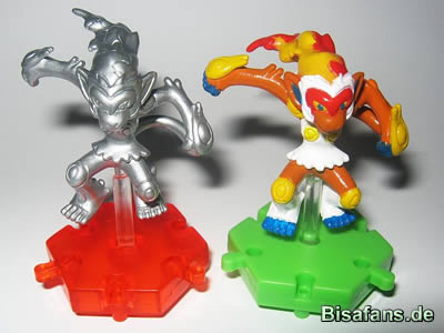 Auf einem Bild seht ihr auch eine Figur in Farbe und eine in Platin. Auf jedem Pokemon ist die Kennung "Nintendo / Pokemon B. China" zu sehen. Die Bodenplatten auf denen die Pokemon stehen lassen sich durch ein Stecksystem zusammen stecken. So kann man z.B. alle 18 Figuren verbinden und besser in einer Vitrine etc.. präsentieren.