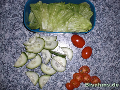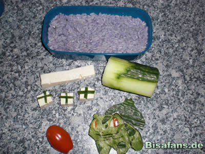 - Dann wird aus einem Salatblatt und Gurkenschale ein Bisasam geschnitzt.