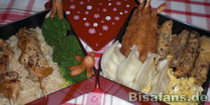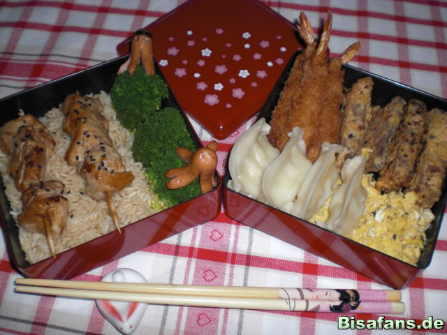 5. Ich habe sie mir gleich in meine Bentodose gepackt: Links Reis mit Teriyakihühnchenspießen, Brokkoli und Wieneroptopusse; rechts frittierte Garnelen, frittierter Furikake Tofu, Gyoza und Furikakerührei.