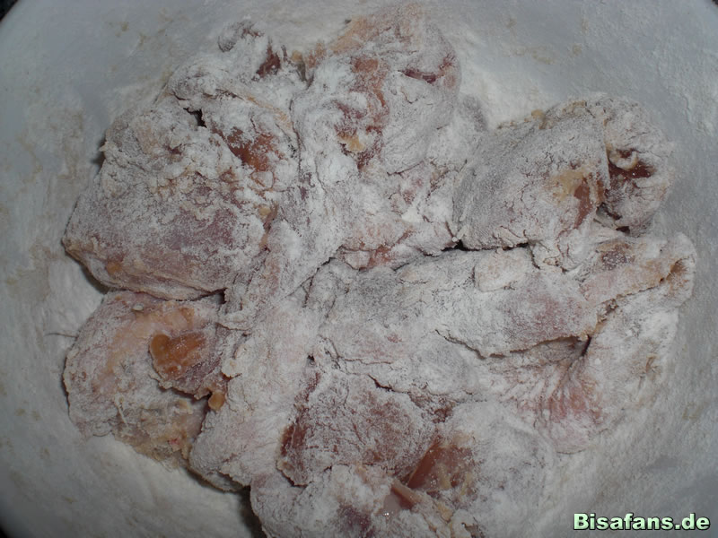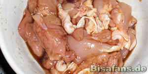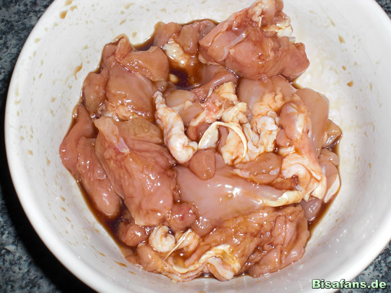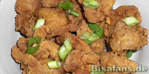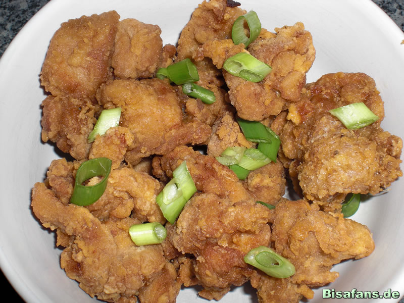 Laut Wiki: Karaage (ist japanisches frittiertes Fleisch, meist Huhn, seltener auch Meeresfrüchte,mit süßer Sojasauce. Hierbei werden Kleine Stückchen Fleisch mit einer Marinade aus Sojasauce, Sake und Mehl frittiert und mit einer Scheibe Limette oder Mayonnaise garniert. Nach dem Rezept von Rumiko: