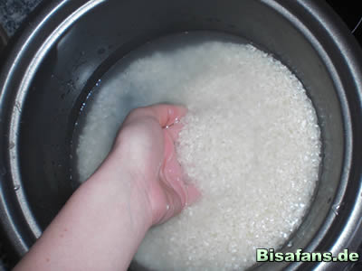 Entweder lasst ihr den Topf mit dem Reis ca. 3 Minuten unter einem fließen Wasserhahn stehen (nicht zu doll anmachen, der Reis darf im Topf nicht umher wirbeln) und lasst das Wasser über den Topfrand hinauslaufen bis es klar ist oder ihr füllt mehrfach den Reistopf mit Wasser und spült ihn mit den Händen durch und gießt das Wasser so oft ab bis das Wasser im Topf klar bleibt.