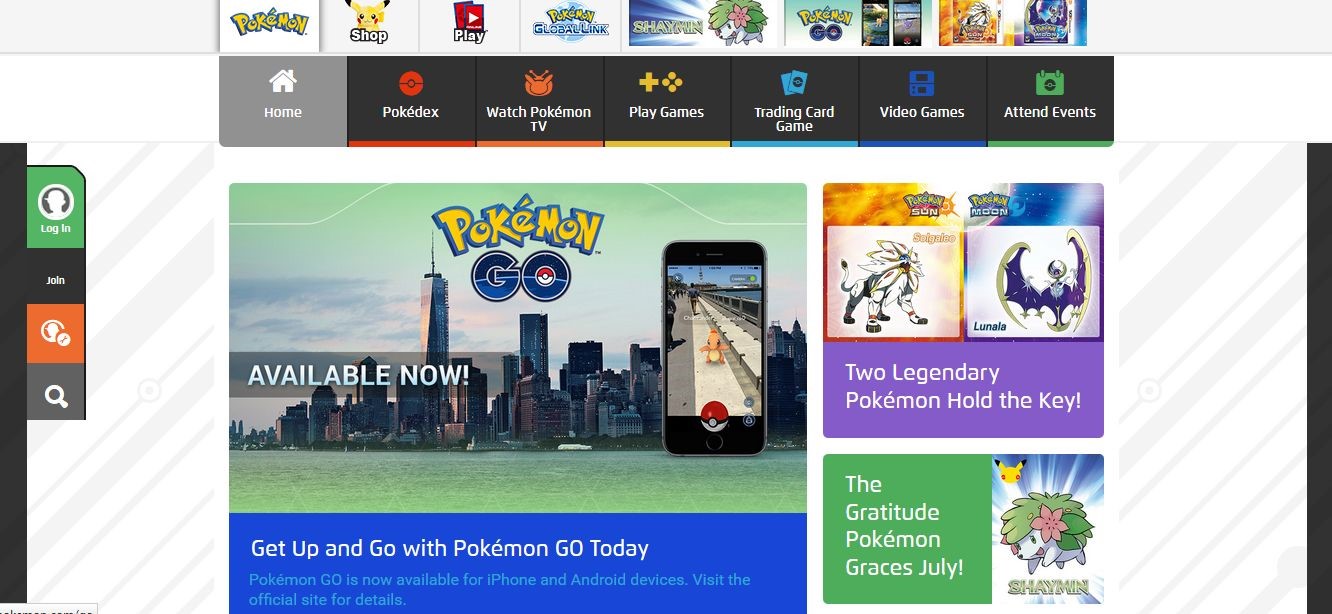 Website-Sektionen mit den Labels „Watch Pokémon TV“, „Play Games“ und „Attend Events“ ein, während es auf der