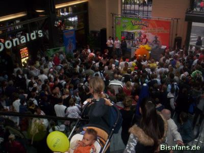 Ursprünglich wollte ich ja mit meiner Freundin Lain zusammen hinfahren, aber sie hatte erst später Zeit, und da ich nicht länger warten wollte, bin ich halt schon mal allein vorgefahren und kam dann so gegen 13:00 Uhr in den Borsighallen an. Vor der „Pokémon-Bühne“ neben McDonalds war es dermaßen voll, dass einige Nicht-Pokémon-Fans sich schon lauthals aufregten, weil sie nicht zum Ausgang gelangten. Wie ich schnell feststellte, war der Grund für diese riesige Ansammlung die Bekanntgabe der Gewinner aus einer Verlosung, die kurz zuvor stattgefunden hatte. Nachdem alle Sieger genannt worden waren, verstreuten sich die Leute wieder und es wurde erstaunlich leer. Für jeden Gewinner gab es einen Countdown von 10 bis 0, den die jüngeren Fans begeistert herausschrieen... also mit anderen Worten, extrem kindergartenmäßig veranstaltet, das Ganze.