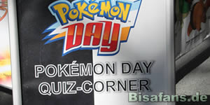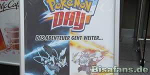 Mehrere Schilder wiesen auf den Pokémon Day bei den Hallen am