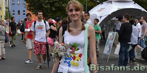 Nachdem ich letztes Jahr alleine auf dem Frankfurter Pokéday unterwegs war, konnte man uns dieses Jahr fast vollständig antreffen und es hat uns wirklich viel Spaß gemacht, zusammen mit den Fans das Pokéday-Feeling zu genießen. Damit die erwartungsgemäß langen Schlangen erträglicher wurden, sind wir vor Beginn gekommen, außerdem musste Maria sich noch in ihr Dialga Cosplay zwängen, eine Prozedur, die nicht allzu schnell geht. Vor Beginn hat es noch ein wenig geregnet, umso toller war es, dass der Rest des Tages trocken verlief. Nachdem wir den Parkour überwunden und unser Pokéday Paket abgeholt hatten, schlugen wir unser Lager an einer der Seiten auf, um Informationen über uns zu verteilen, Fans zu treffen und natürlich auch, um unsere Tauschaktion fortzuführen, die wir im vergangenen Jahr starteten. Vor allem, nachdem wir einen kleinen Live-Podcast auf der Bühne zum Besten gaben und uns kurz vorstellten, hatte unser kleiner Stand sehr viel Andrang, ein tolles Erlebnis. Desweiteren hat Oli P wie jedes Jahr für tolle Unterhaltung über den gesamten Tag gesorgt, Strategiebegeistergte konnten ihr Können im Fanturnier unter Beweis stellen und jeder konnte die neuen Editionen X und Y im Pokémon Bus anspielen. Für uns machte den Pokéday vor allem die Interaktion mit anderen Fans aus, wir hatten alle sehr viel Spaß dabei, mit euch zu quatschen, tauschen, kämpfen und vieles mehr. Frankfurt bildete einen tollen Auftakt für die Pokéday Saison 2013 und wir freuen uns, euch nächstes Jahr (wieder) zu treffen!