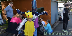 Menschen und Pokémon. Im Dialga-Kostüm steckt
