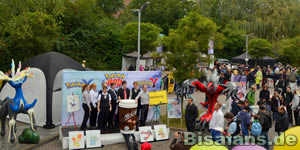 Die Pokémon Day Bühne in Hamburg und ein Hinweisschild.
