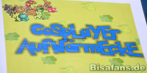 Das BisaCast Aufwärmzelt für Cosplayer und BlackSpy mit dem Fan-Stand