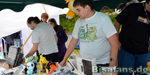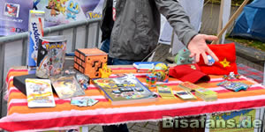 Ein Fan im Evoli-Kostüm und eine der vielen Gewinnspiele auf der